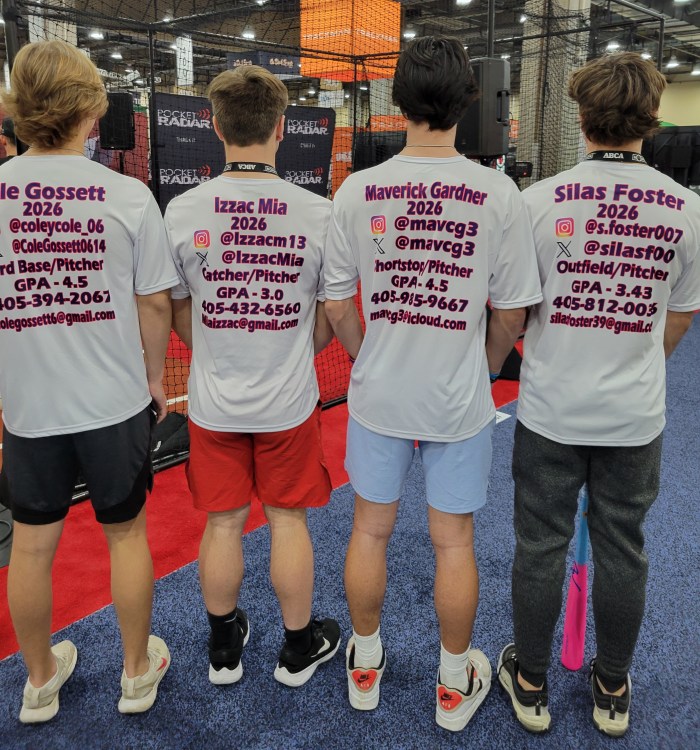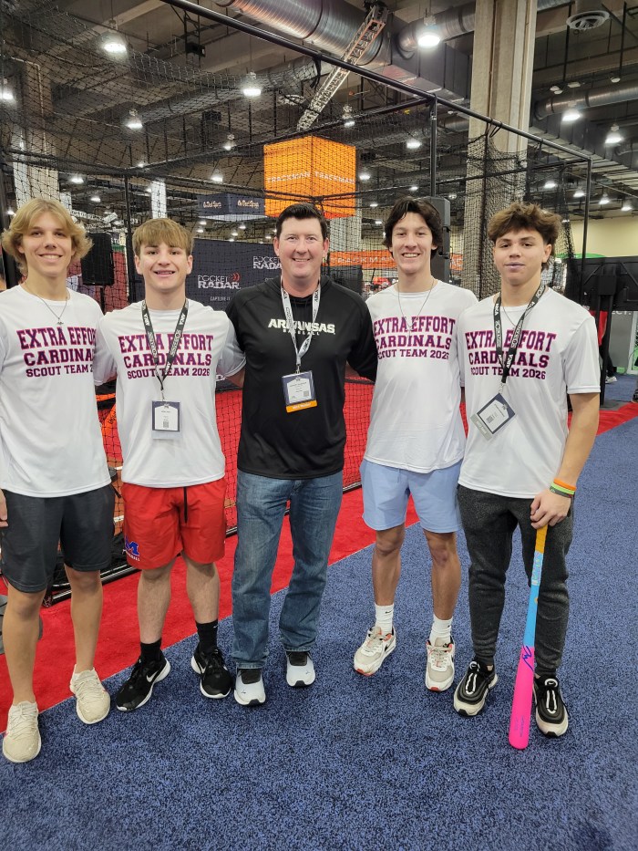 Back in January 2024, I spotted four young men working the ABCA exhibit floor in almost-matching t-shirts, cages to cages, booth to booth. Sophomores. Class of 2026. Jarrett Gardner’s Extra Effort Cardinals out of Oklahoma City, wearing their contact info on their backs like they meant business.